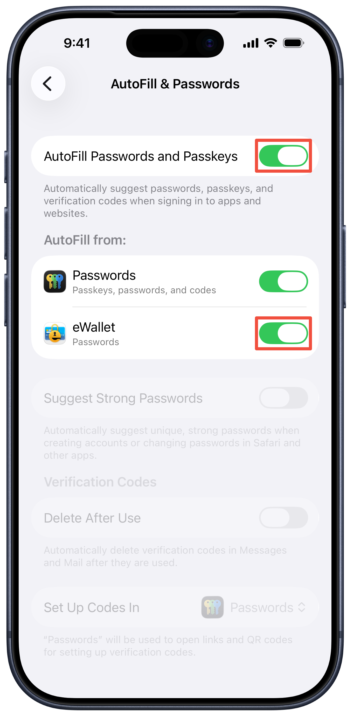 To use eWallet in combination with your iPhone or iPad’s AutoFill (iOS 12 and later), you first need to make sure AutoFill has been configured for eWallet (note you only need to do this once):